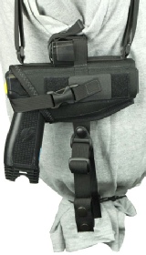 Belt tether clip keeps the shoulder holster from riding up and moving while holstering or removing.